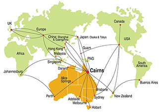 Cairns International Airport is Australia’s gateway to the Asia Pacific and is located only 10 minutes from the centre of Cairns. A number of international flights land at Cairns, including flights from Singapore and Japan (Jetstar), Hong Kong (Cathay Pacific, Qantas) and North America via Auckland (United). There are also many domestic connections to Cairns for international flights that arrive in other Australian cities, e.g. Brisbane, Sydney or Melbourne.